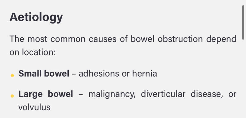 A very common reason for acute presentations to A&E/Surgical Units. Some further resources around small vs large bowel obstruction and key history taking points, risk factors and clinical findings. Zero to Finals is a great you tube channel and website with resources!
